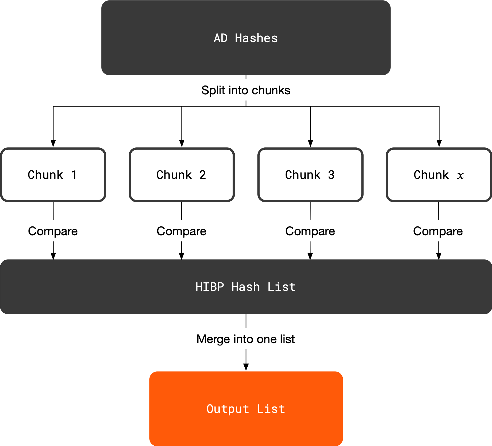 Lil Pwny splits the list of AD user hashes into equal-sized chunks of number of cores - 1, leaving one core to handle the list shared across processes . A process is then created for each of these cores to search their chunk of the AD user hash list against the HIBP hash list