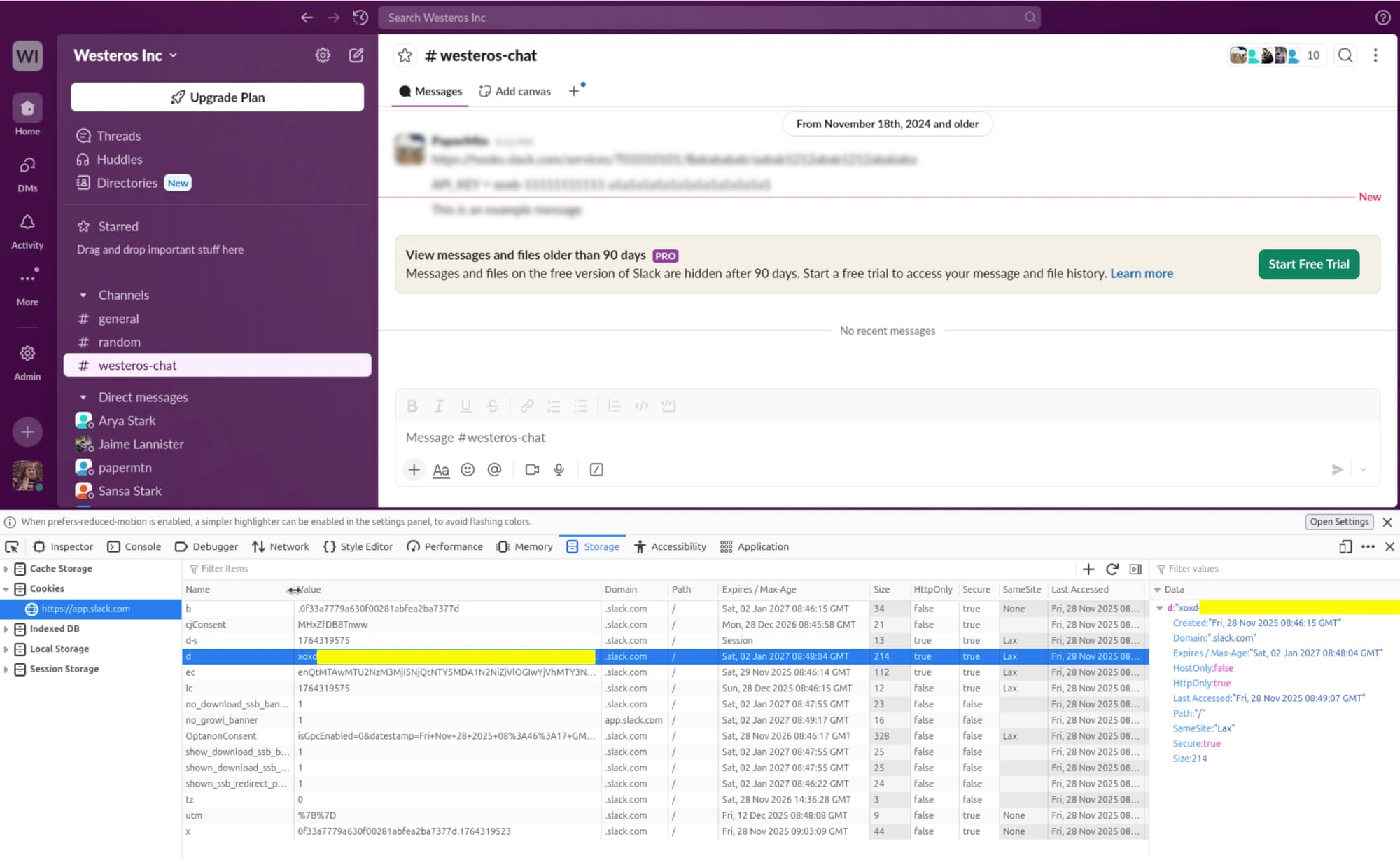 curl -L --cookie "d=xoxd-REDACTED" https://westeros-inc.slack.com