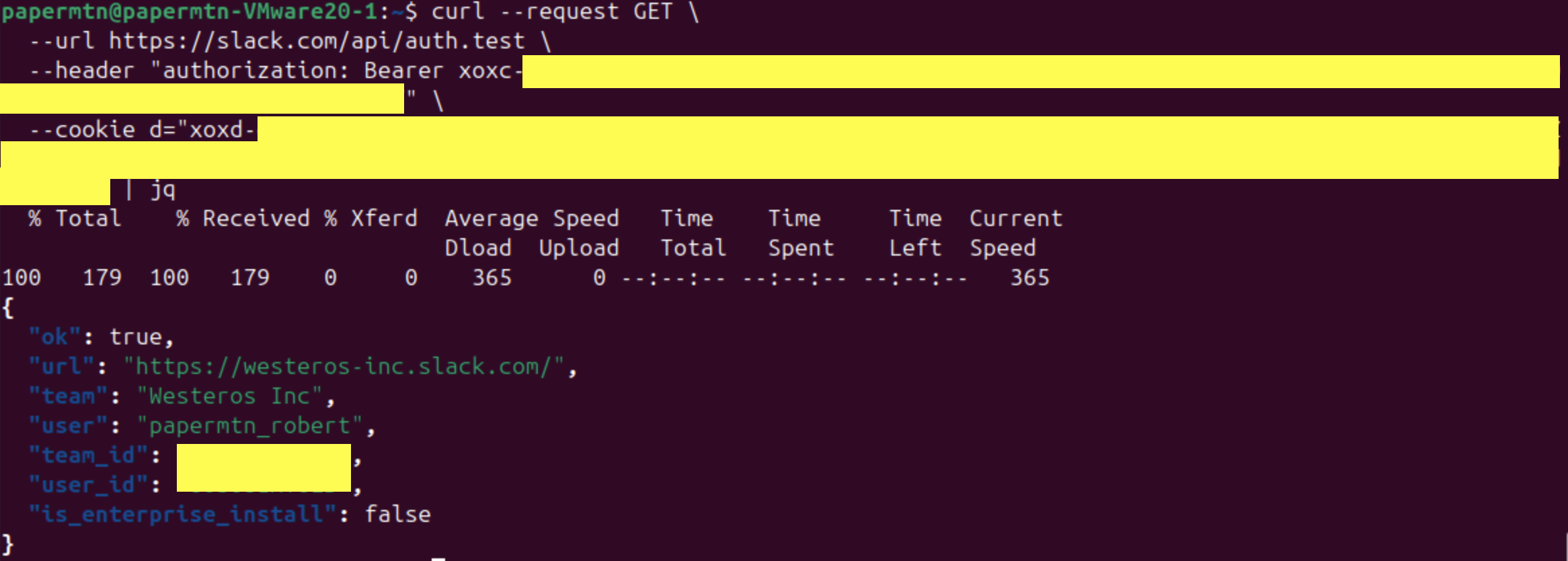 Make an HTTP GET request via cURL to a workspace you know the user has access to. I know that the user cookie I’ve got has access to the slack workspace westeros-inc, so I send a request like this: