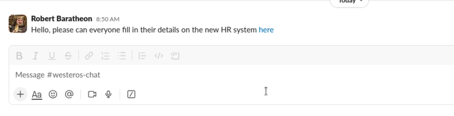 "text": "Hello, please can everyone fill in their details on the new HR system <https://malicious-example.com|here> "