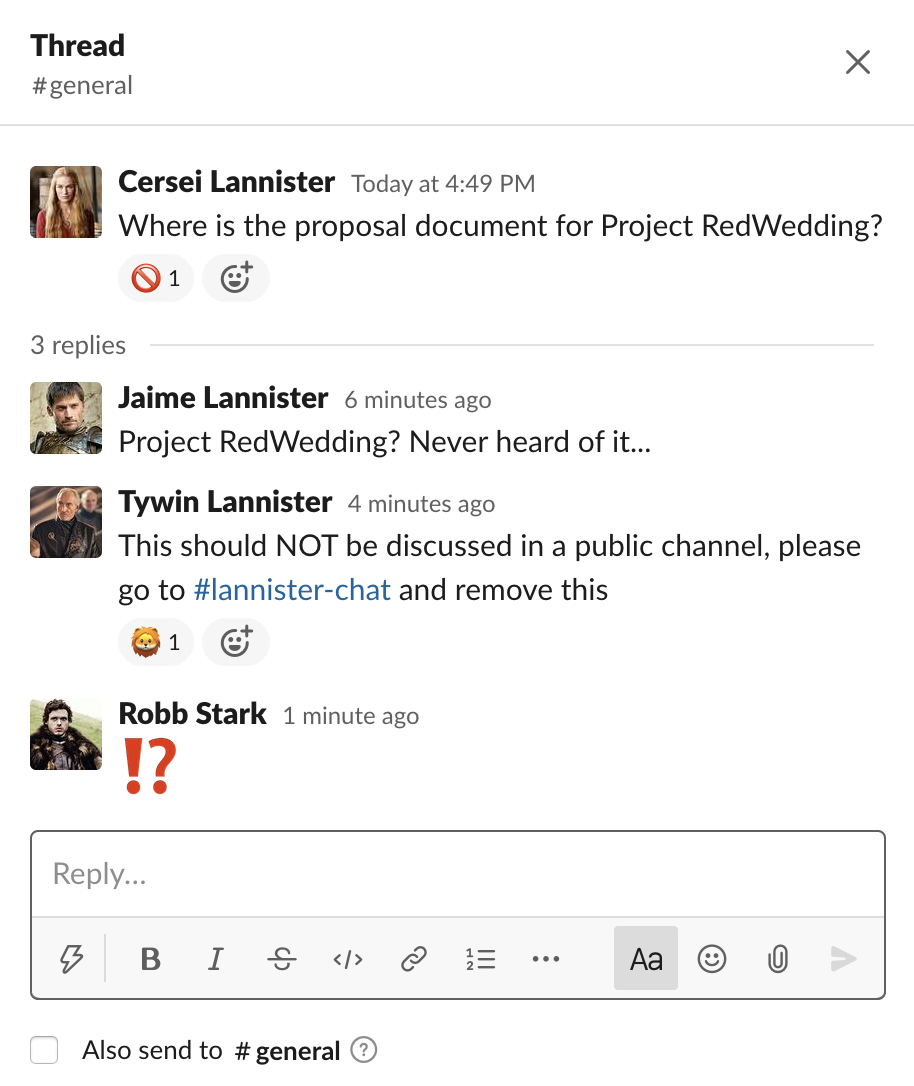 So, for example, in Westeros Inc there is the secret project underway: Project RedWedding. Those involved in Project RedWedding don't want it to be discussed in public... because of reasons. Luckily, they are running Slack Watchman to monitor their Slack workspace, and have added the phrase RedWedding to the custom searches, so they were alerted that the phrase had been used in a public channel. They are then able to quickly contact the person who made the post, or remove it themselves.