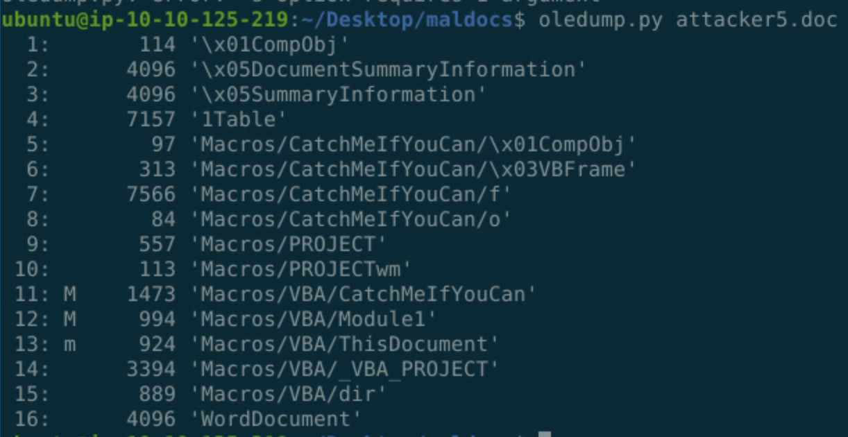 We're looking for a string caption, so lets try oledump to see what streams we've got in the document: