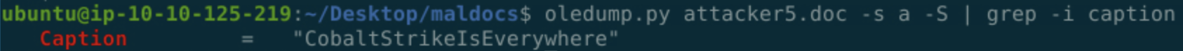 oledump.py attacker5.doc -s a -S | grep -i captionWhich gives us exactly what we want: