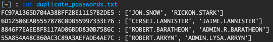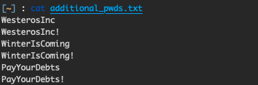 I also have a suspicion that some of Westeros Inc’s users may be using insecure passwords related to the company, which may not be in the HIBP list, so I have created the following file with some passwords of my own to search for:
