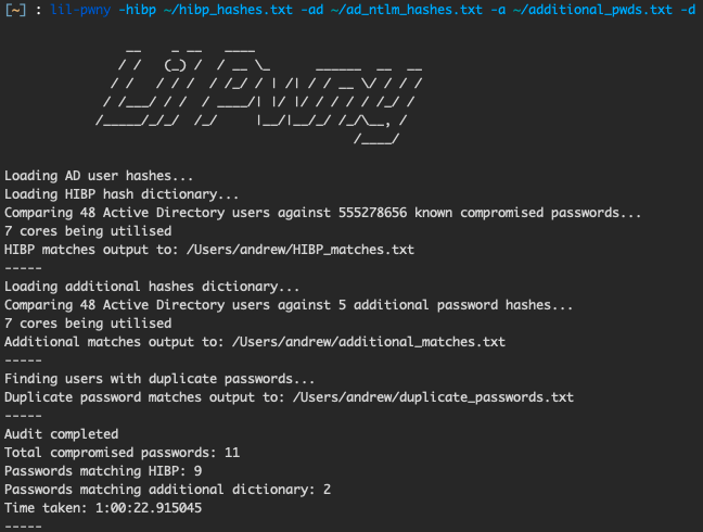 lil-pwny -hibp ~/hibp_hashes.txt -ad ~/ad_ntlm_hashes.txt -a ~/additional_pwds.txt -dAs well as the passwords matching HIBP, I also want to see the ones matching my custom input list, as well as accounts using duplicate passwords.